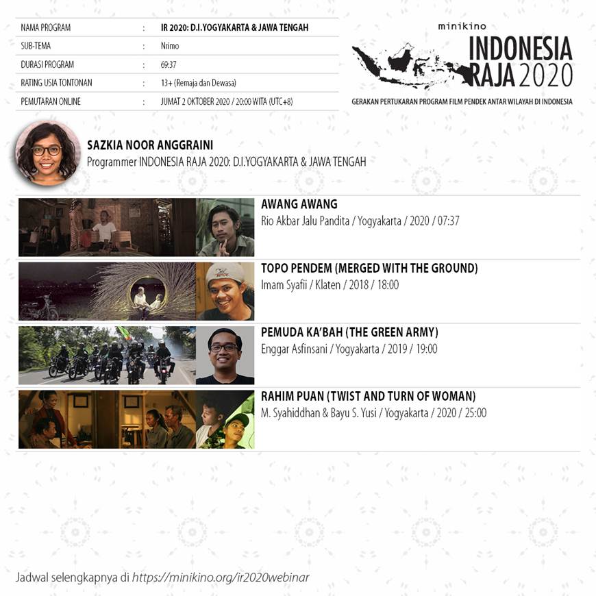 Rangkaian kegiatan webinar ini mendapat dukungan dari Kementerian Pariwisata dan Ekonomi Kreatif. Detail rangkaian acara dapat dilihat di minikino.org/ir2020webinar